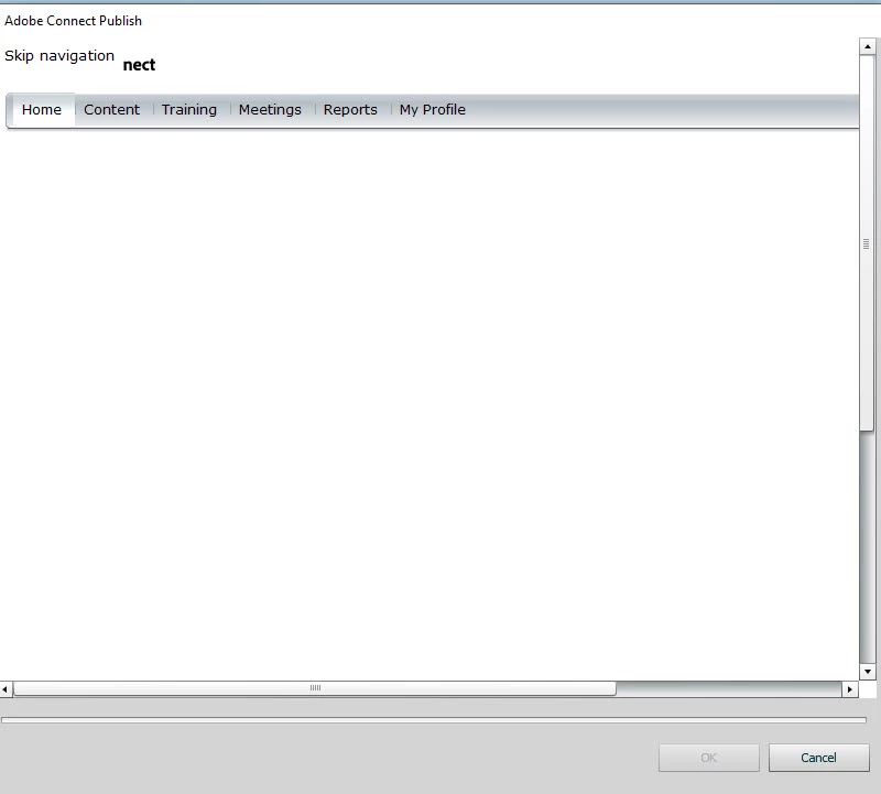 I am trying to publish my Captivate projects directly yto Adobe Connect; however after enteting my credentials I just have a blank screen with no option to publish to a new or extisitng folder.