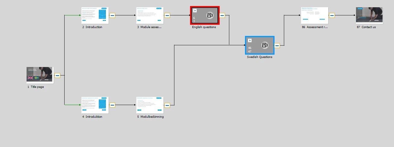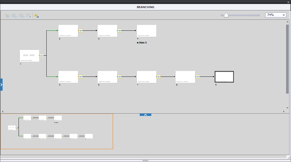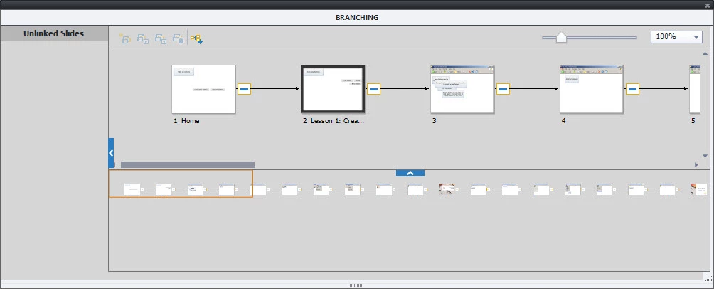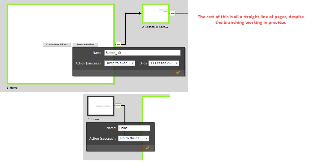 I have a Captivate 2019 file with two branches. The table of contents slide has two buttons: one jumps to the slide for the first branch (slides 2-10) and the other jumps to the second branch (slides 11-20). There are also a few other buttons that help to navigate between the table of contents slide and the two lessons) When previewed, the buttons all work just as expected. However, when I view them in Branching View, the branching does not show. It just appears as a straight line (picture below). What could be causing this?