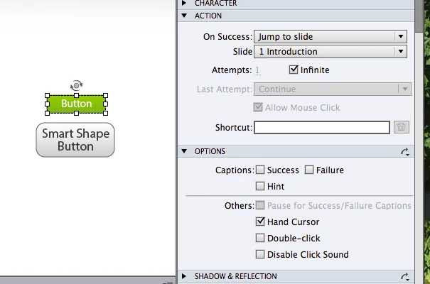 I created a simple button; INSERT-->STANDARD OBJECTS-->BUTTON (as below) then I changed the "On Success" parameter to "Jump to Slide" and chose a slide at random as shown.