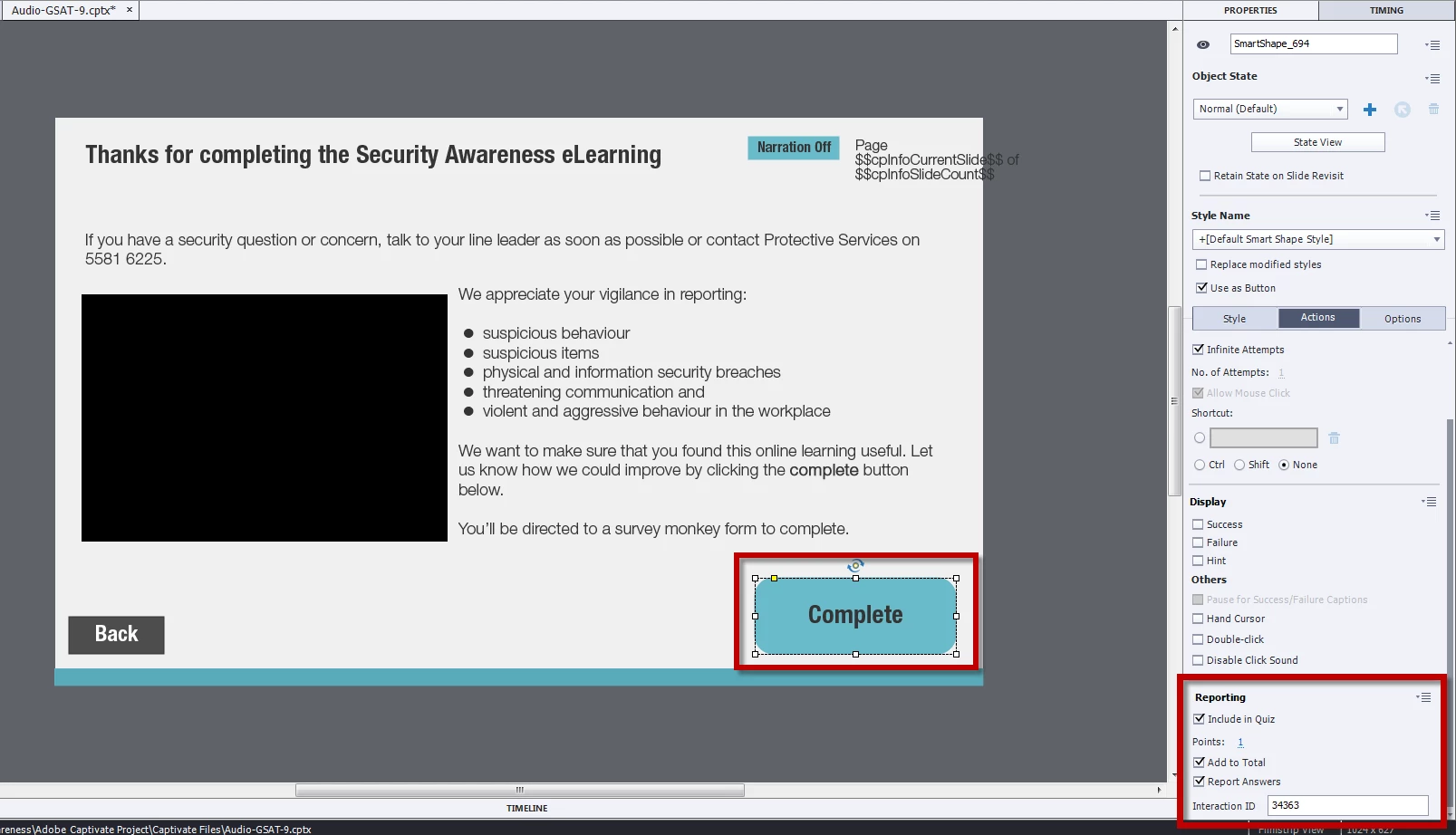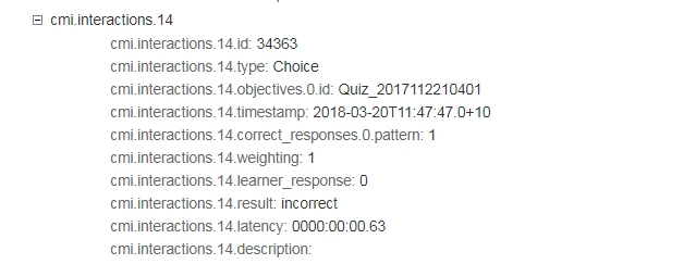 Below are the details of a user being marked as 'incorrect' when clicking the button - and a screenshot of the button / quiz settings for that interaction.