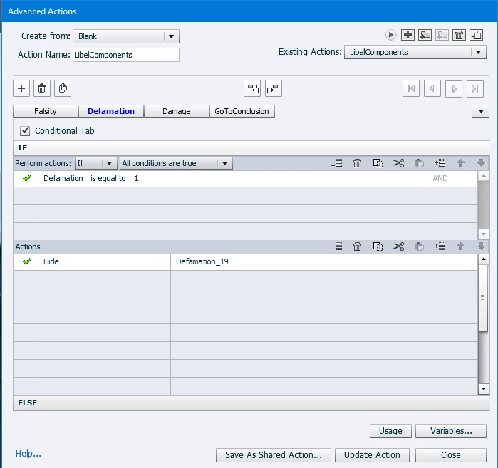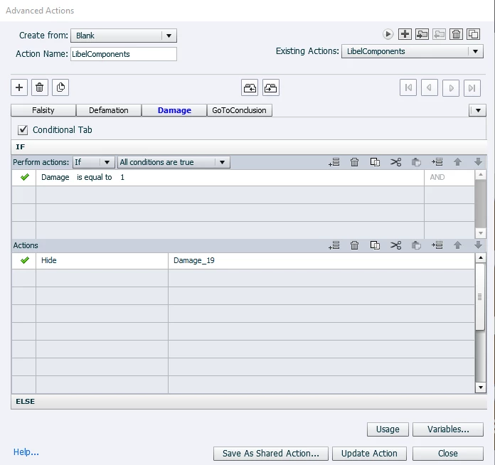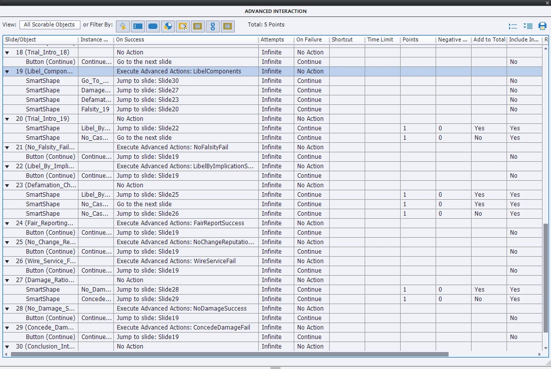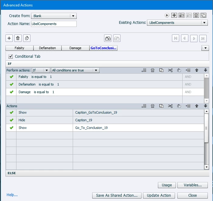 An advanced action is launched upon entering Slide #19 to check for increments in variables. This is used to hide the buttons that have already been selected. This advanced action works fine and hides the Topic #3 button if it is selected, but again Topic #1 and Topic #2 button are still present but non-functioning if Topic #3 button is selected first. Another part of the script checks to see if all buttons have been selected, in order to determine whether or not to show the "Go to Conclusion" button.