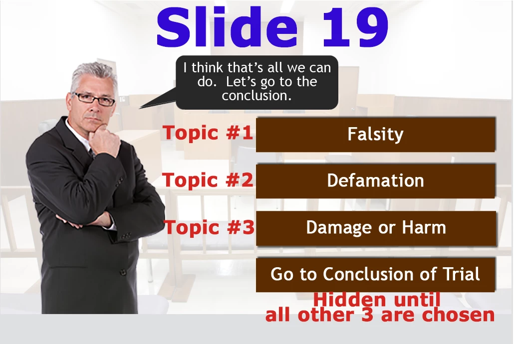 All that has been described works perfectly, unless the Topic #3 button is chosen first! If Topic #3 is chosen first, the module branches off and asks the user to make a choice about the topic, just as it does with all other topics. Variables and scripts record their choice. Once completed, the module takes the user back to Slide #19 where the buttons for Topic #1 and Topic #2 now no longer function! Their hover state changes. A click noise is heard when pressed. But there is no longer any slide navigation functioning with the buttons. The buttons for Topic #1 and Topic #2 will always work fine, unless you have chosen Topic #3 beforehand, visited the branching slides, and then returned to Slide #19.