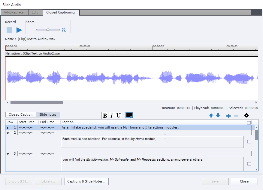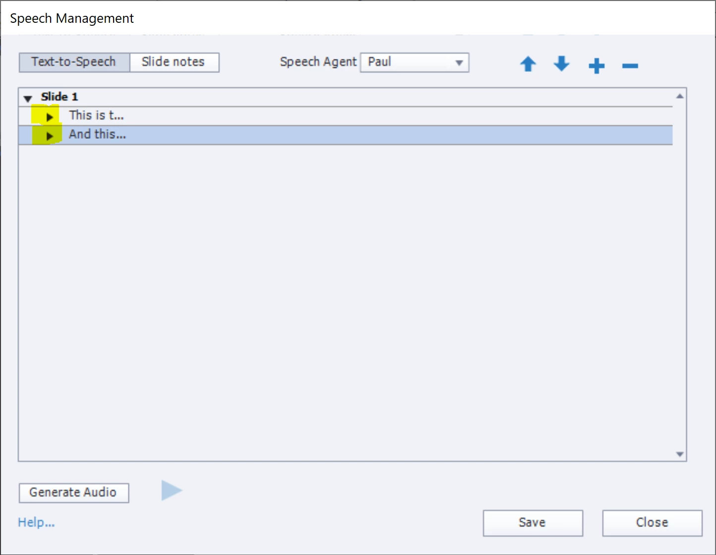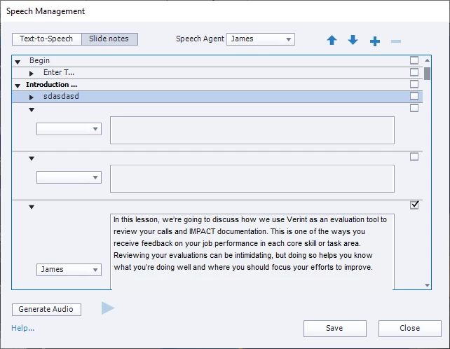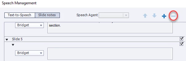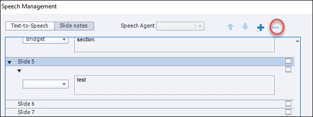 In my experience the best place to manage and edit Slide Notes is NOT from the Speech Management dialog or the Caption and Slide Notes dialog reached from the Slide Audio dialog.