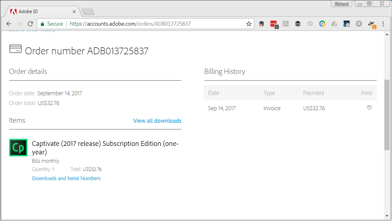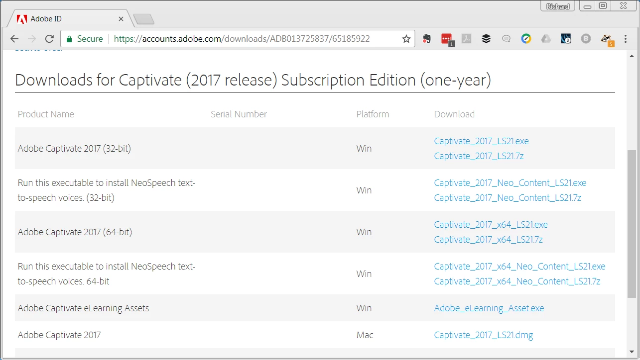 For some reason my properly licensed Captivate 2017 has started asking for a serial number. When I go to my Adobe.com account and navigate to the downloads and serial numbers page, the downloads show but the serial numbers are missing.