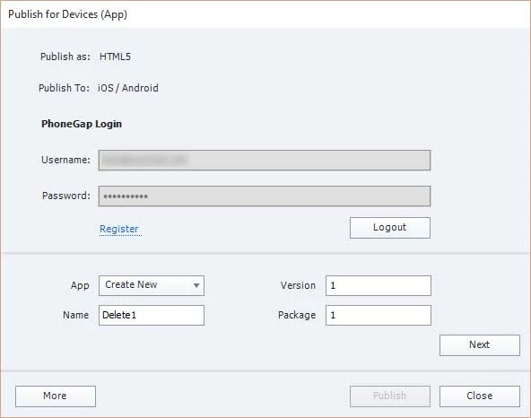 2. From the Captivate toolbar, chose Publish > Publish for Devices. Logged in to Phone Gap, chose to create a new app and gave it a name of Delete1. Clicked Next.