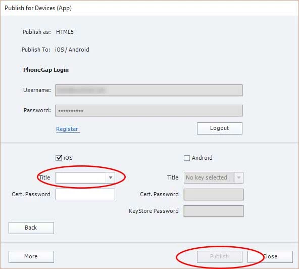 3. Chose to publish only as iOS, but can't type or choose anything in the Title combo box. This is where the Publish button is grayed out. I'm also confused about the Password field. Is this where I create a password or where I use one created elsewhere?