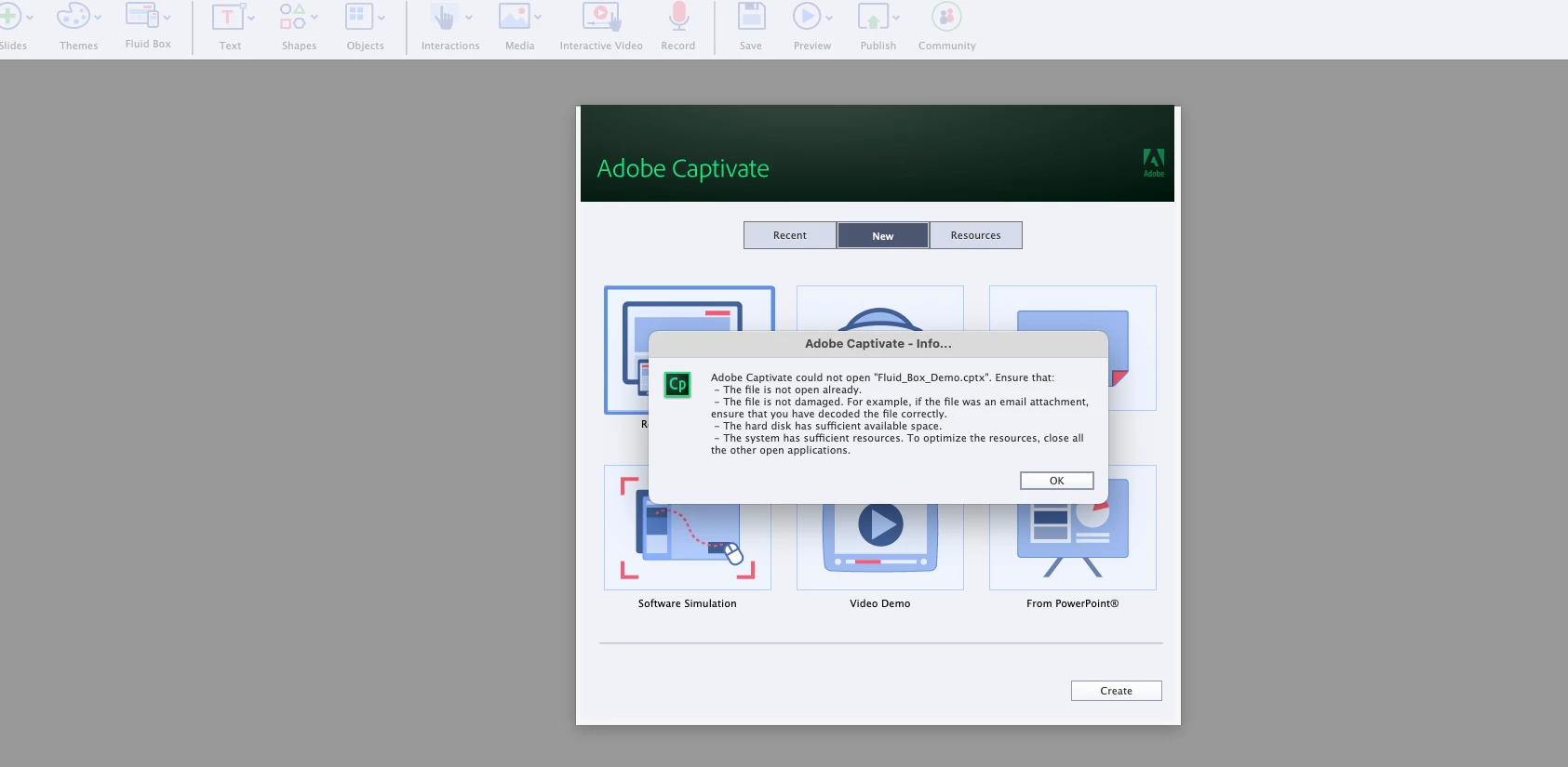Cannot create a ppt or responsive project , i get the following error when selecting start a new responsive project. and If i select PPT , it lets me upload and then the pop up screen goes blank