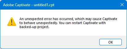 An unexpected error has occurred, which may cause Captivate to behave unexpectedly. You can restart Captivate with backed-up project.