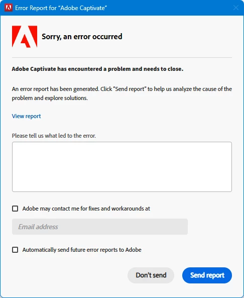As soon as I click [OK], the Error Report for "Adobe Captivate" dialog appear and Captivate crashes back to the Windows 11 Enterprise desktop