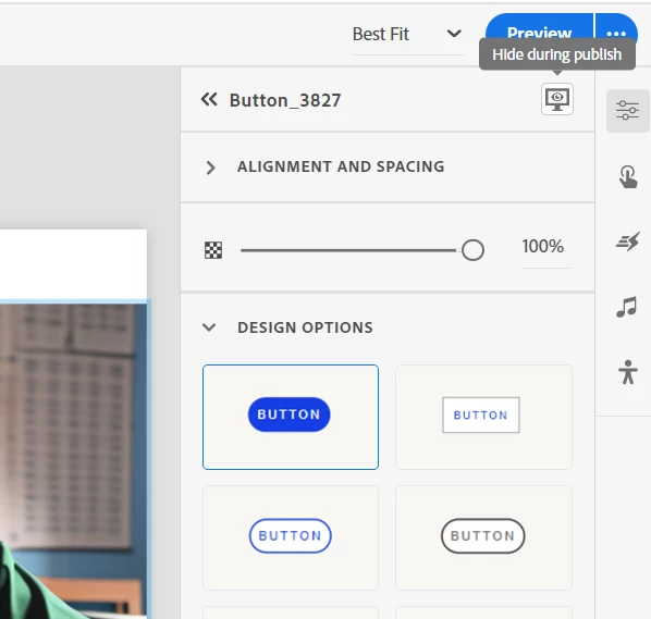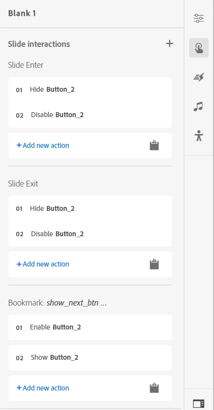 2. In the button interaction click Hide during publish. Create a slide interaction of Show button at bookmark, with the bookmark located 5 seconds from the end of the slide.
