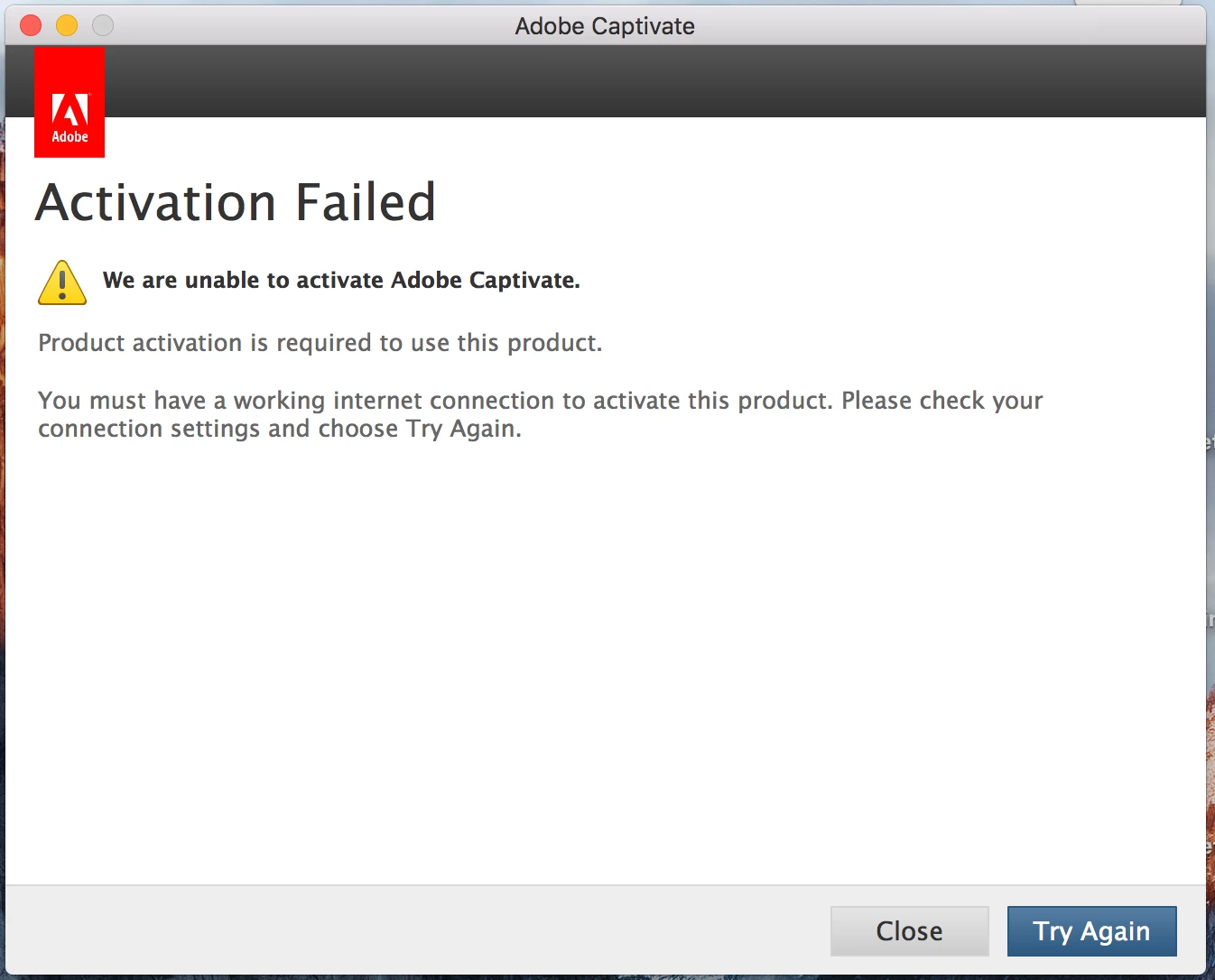 My captivate crashed this morning and now I get an error message saying Activation Failed when I try to open it. My internet is working fine, my license is fine...any suggestions on what I can do?