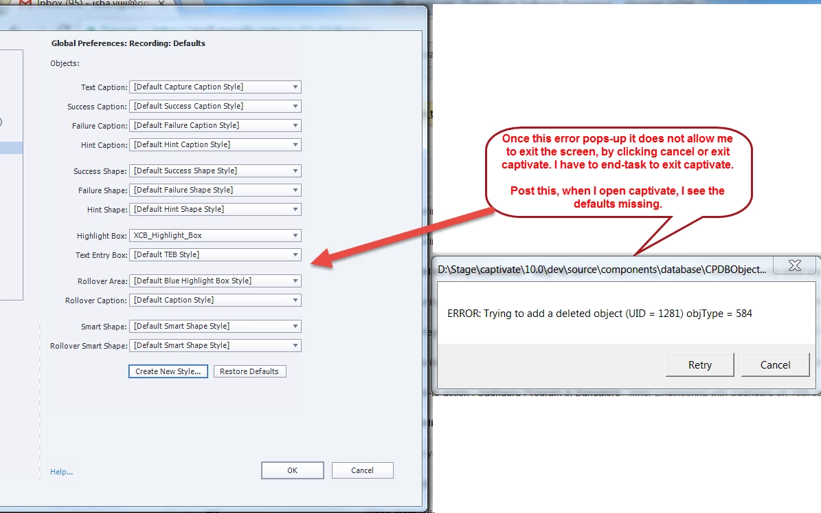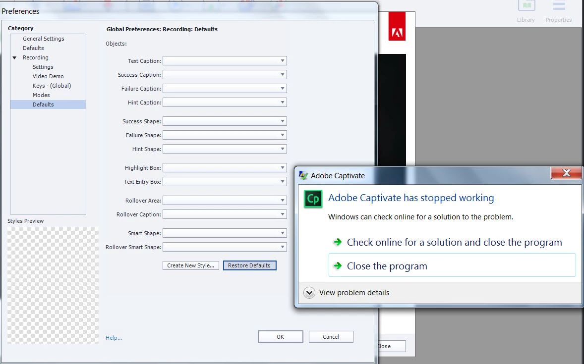 When I click the "Restore Defaults" button, Captivate displays the message "Adobe Captivate has Stopped Working".