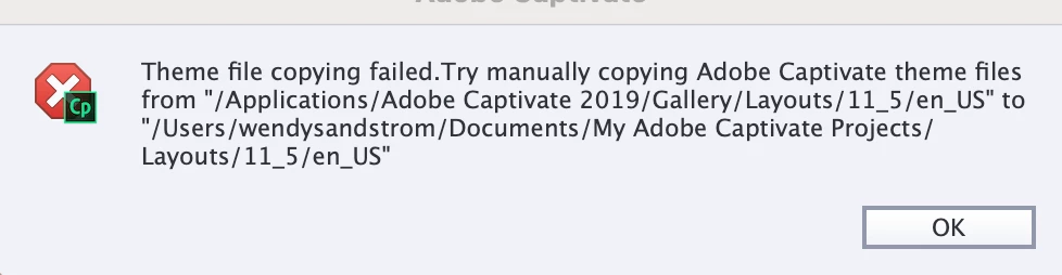 Running Mac OS Big Sur 11.6. Tried installing Captivate 2019. Once software was installed, after launching it, the splash screen comes up with "loading..." text and almost immediately an error message about template files (see attached). I used to have Captivate 2019 installed on this same machine, same version OS.
