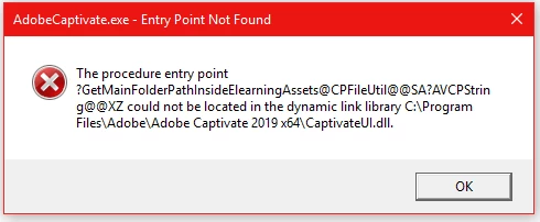 I recently tried updating my Captivate 2019 to the latest version, though before the update could make it to 100%, there was an "update failed" error message. After that, when I try to open up Captivate I receive an error message titled "Entry Point Not Found" It looks like this -