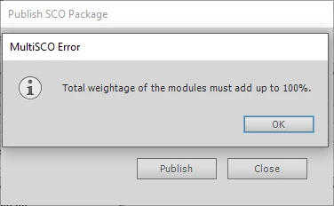 I'm using the Simple Remediation option in the Multi-SCO packager and I keep getting the MultiSCO Error message "Total weightage of the modules must add up to 100%." I have 36 modules; 28 of them have a weightage of 3% and 8 of them have a weightage of 2% for a total of 100%. In these 36 modules I have 75 individual zip files. The first module has 4 zip files for the Content, and 1 for the Post-test. The rest of the modules have 1 zip file for the Content and 1 zip file for the Post-test.