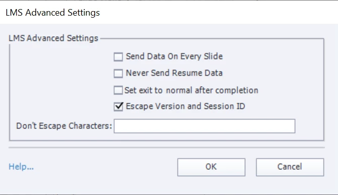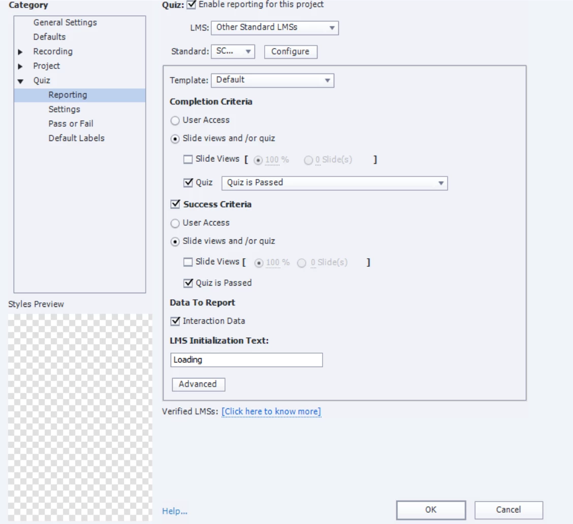 For the Standards fields in the below screenshot, I selected SCORM 2004, and selected 3rd Edition through the Configure button.
