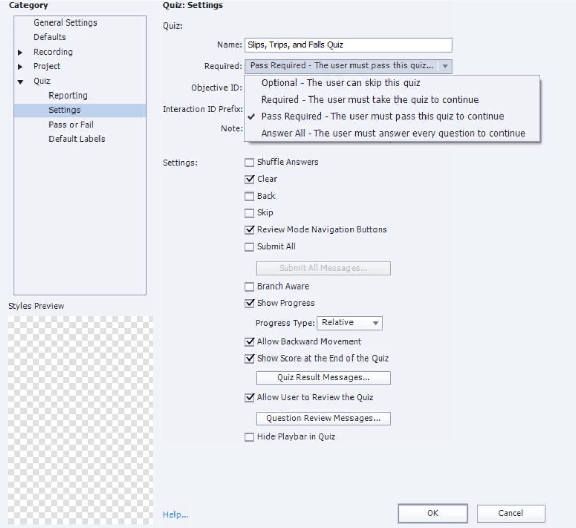 In the below screenshot, is selecting "Pass required - The user must pass the quiz to continue" preventing the user from continuing to the Thank you slide at the end, if the user clicked the Review Quiz button, after all their attempts at passing the quiz failed. Should I select "Required - The user must take the quiz to continue" instead, to enable the user to proceed to the Thank You slide, if the user clicks the Review Quiz button before passing any of their attempts?