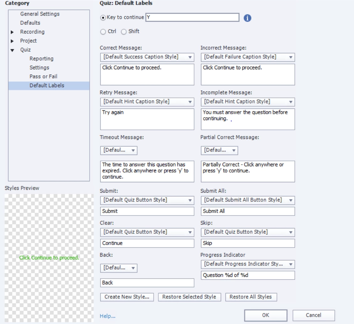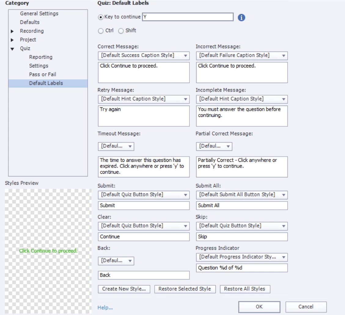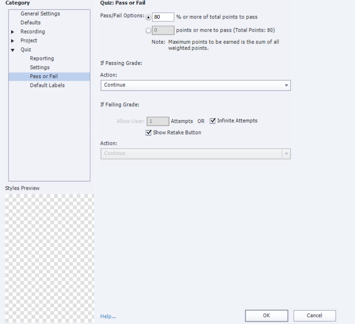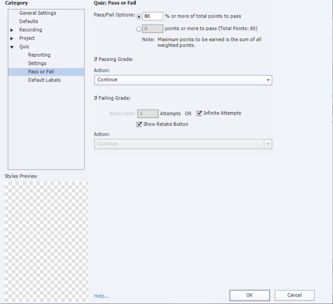 Here are some Quiz Settings screenshots for review from my Captivate 2019 file: