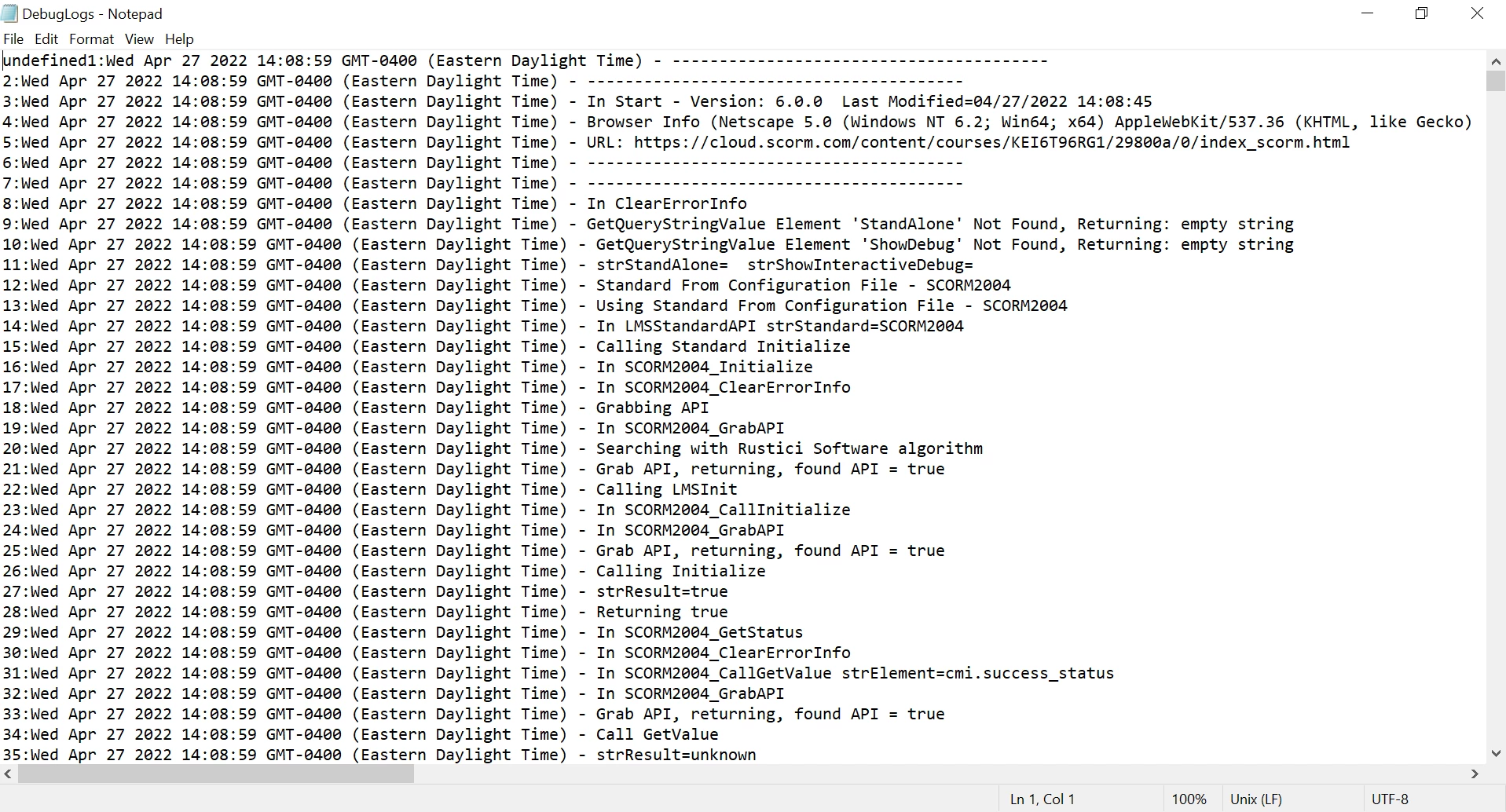 Upon closing the Communications Log, I also took a screenshot of the SCORM Cloud Test Results: