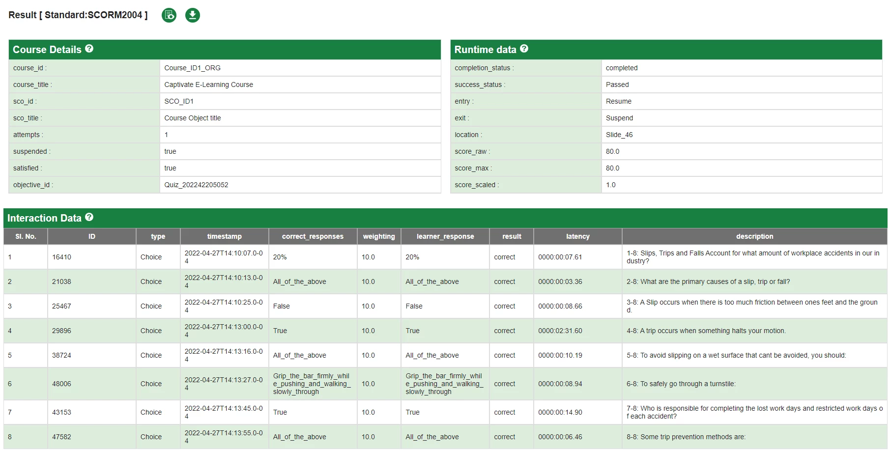 I created a compliance course with an 8-question quiz in Captivate 2019. When I upload the course on CSOD LMS, the Course shows In-progress under two scenarios.