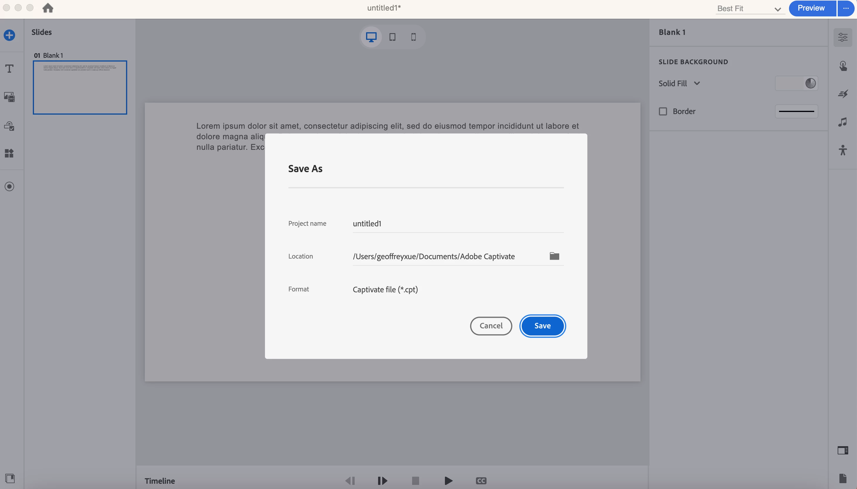 Hi! I recently downloaded Adobe Captivate (2023) through the free trial option, and I'm unable to save any edits, whether it be through a template or with a new project. It shows the loading icon indefinitely and I eventually have to force quit the app.