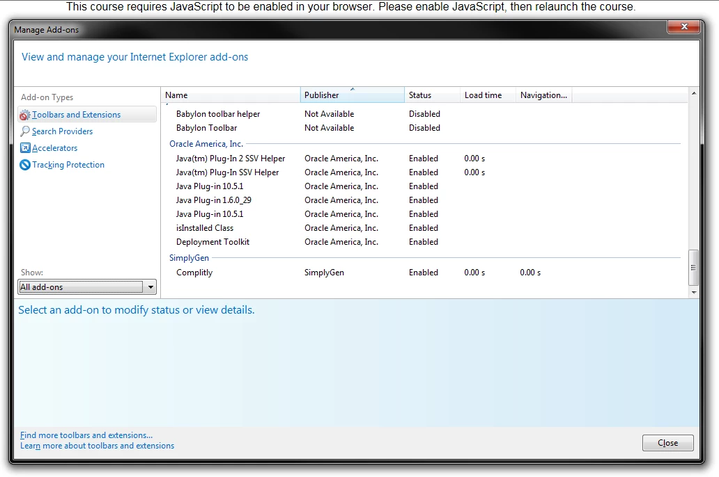 6. Browser opens and there i get a message that Java script is missing, which it is not )see second screen: