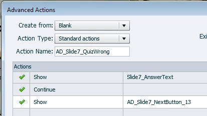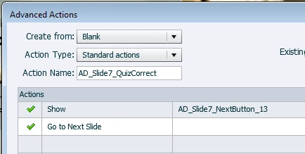 This solution works in that the next button does show on the slide if the learner is right or wrong, but it locks up/freezes the buttons on the following content slide until the module is exited and reopened. I'm assuming this is most likely due to the advanced actions breaking the quiz logic somewhere?? .