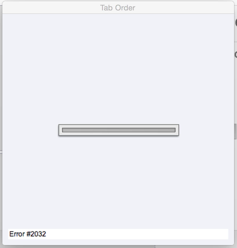 When I attempt to open the tab order pane in Captivate 8, the panel never finishes building on the screen. It simply displays what looks like an empty preloading bar. At the bottom of the panel is a status bar with "Error #2032" in it.