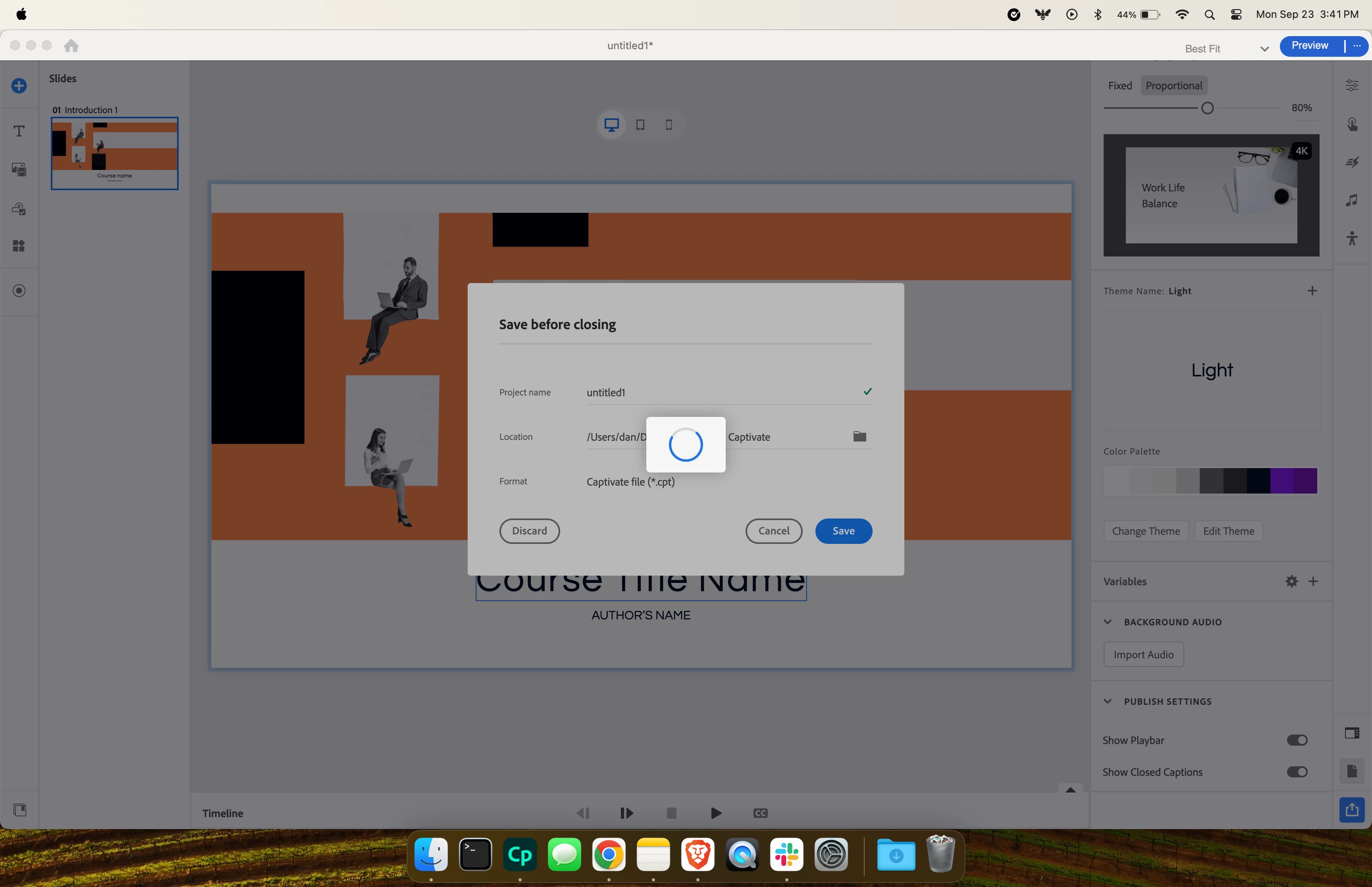 If I open any Captivate file, I can edit it, build slides, do whatever I want within the application. But when I go to save the file, I just get a blue spinning wheel forever. If I “right-click -> quit”, the application does not quit. It’s just frozen. I have to go to my Mac force quit operator and force quit the app.