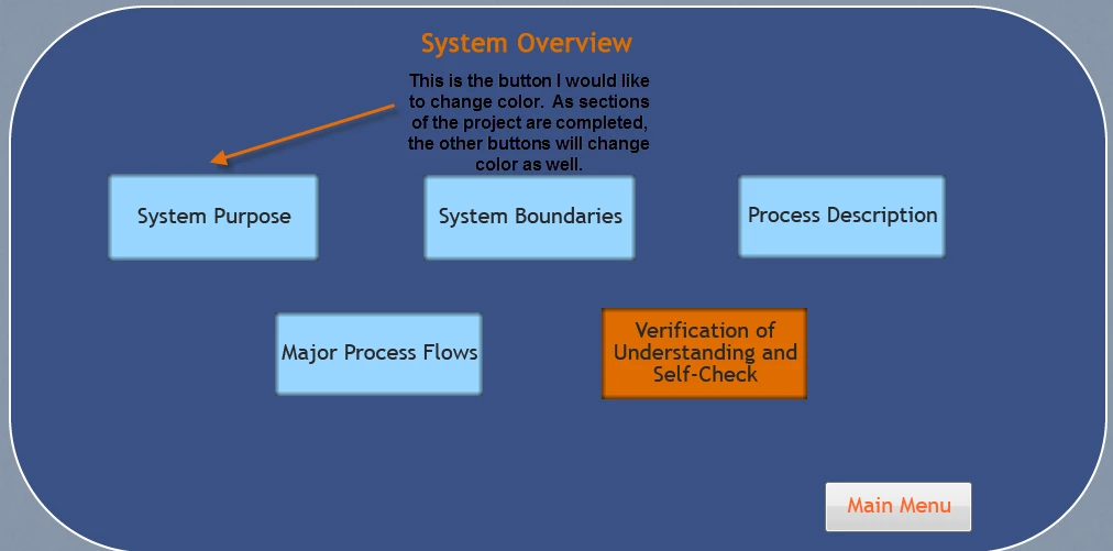 In the current project I am working on, I need a button on a menu screen to change color after clicking a button on another screen. I already have a standard action set up to "disable" that button, but the color stays the same.