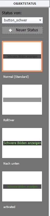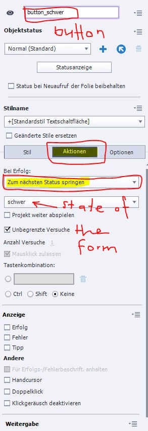 In the "normal" action interface on the right, I have already achieved to change the state of the geometrical form everytime I click the button. But in this case, the button stays the same state. With the advanced actions I didn't find the option "go/jump to the next state", which I was using with the "normal" action interface.