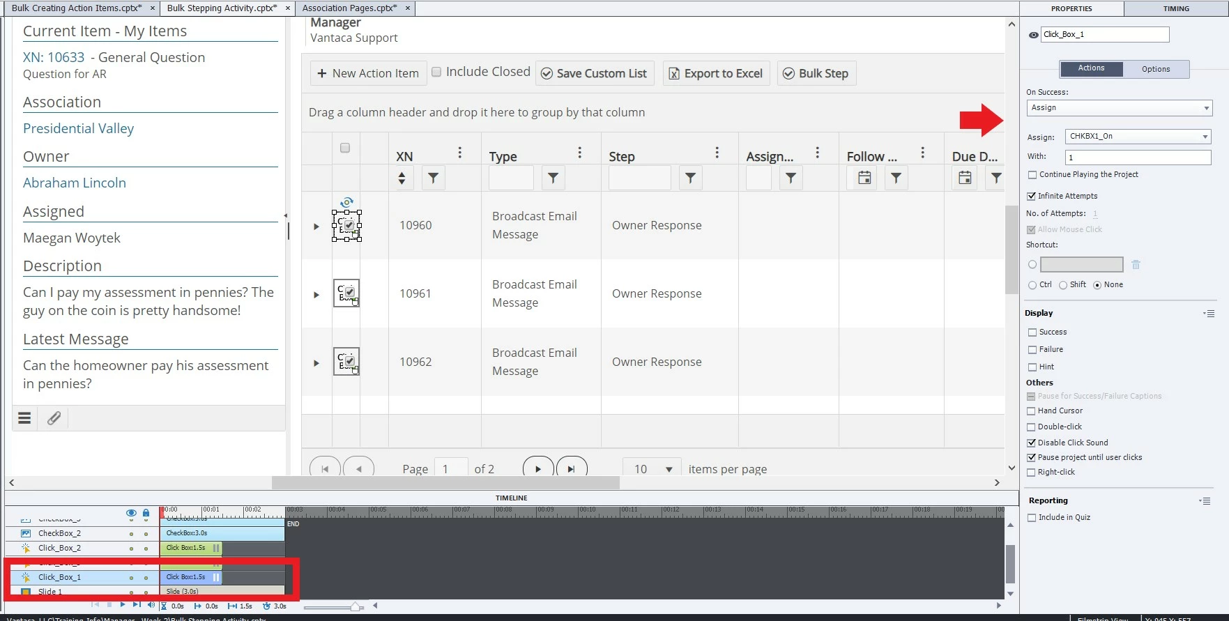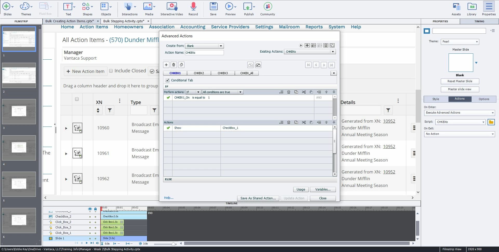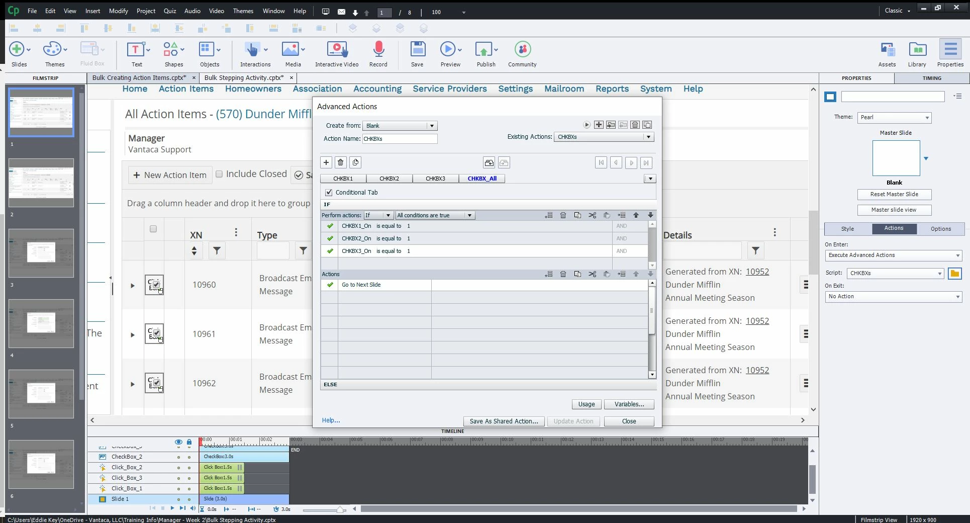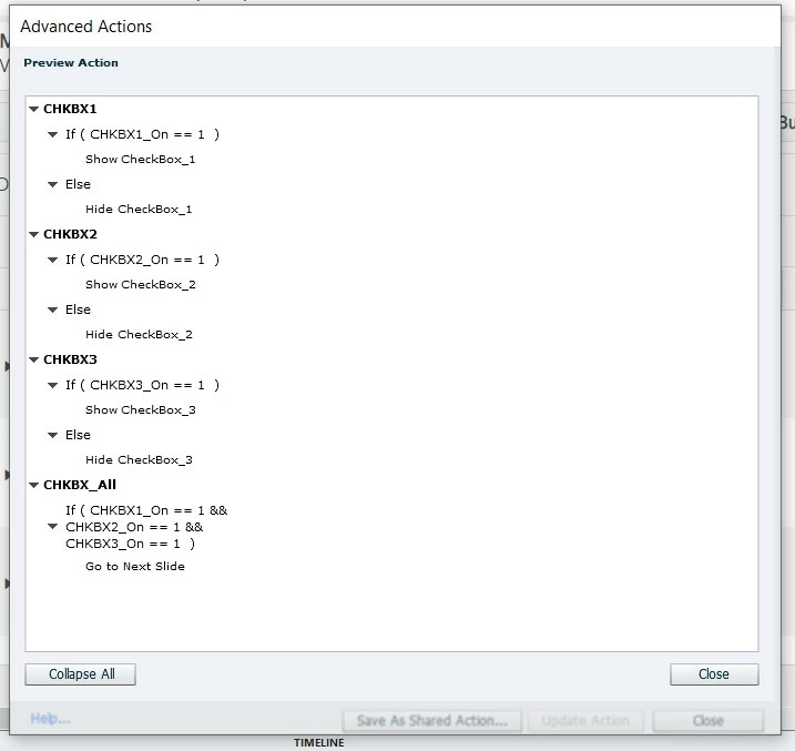 Now I have three check boxes that I need clicked in order to click a final click box to "select" and go to the next slide. Meaning within my Advanced Action, I have another rule that