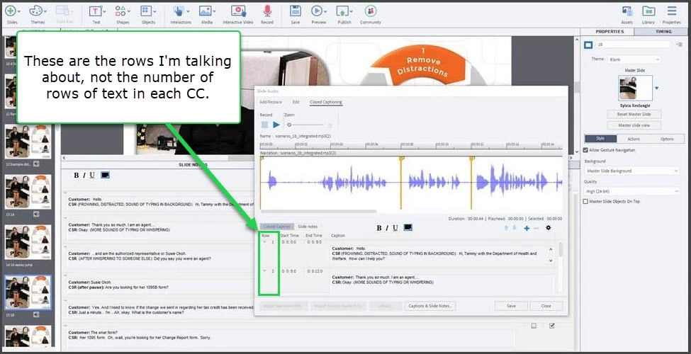I have 8 rows of notes that have been selected for Closed Captioning. When previewed in the Closed Captioning editor, everything seems great. But, unfortunately, when I Preview HTML5 in Browser, OR when I publish to HTML5 and play, not all of the rows appear. For example, rows 1 and 2 display correctly, then it "hangs" on row 2, doesn't display row 3 at all, and then row 4 will appear at the correct moment.