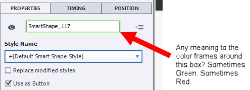 When I work with a particular smart Shape sometimes the frame in the properties panel changes from green to red.