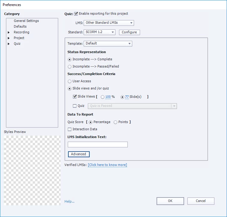 I have a HTML5 course in Captivate 2019 that has two different tracks on the first slide, each track goes to a main menu with module buttons that nagivate to branching scenario slides. I have the quiz settings set to: