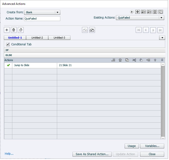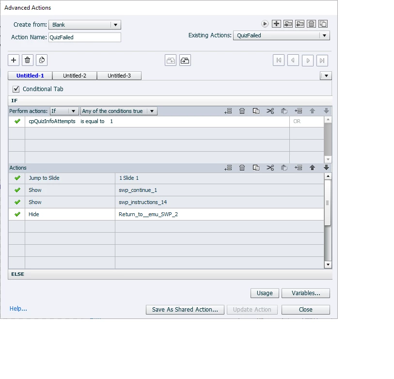 IF cpQuizInfoAttempts is equal to one 1; ACTION jump to slide 1; ELSE jump to slide 21 (which is a you failed noticed and instructions on next steps)