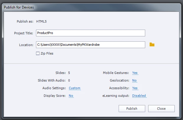 Need some quick direction. I'm publishing my first responsive project for devices. On the publish menu my options are to Publish for Devices or Publish to Adobe Connect (no other options). Once I click Publish for Devices, the Publish dialog box displays as show below. It's missing the drop down for Publish To: so that I can choose Windows 8 or PhoneGap, etc. What am I missing here?