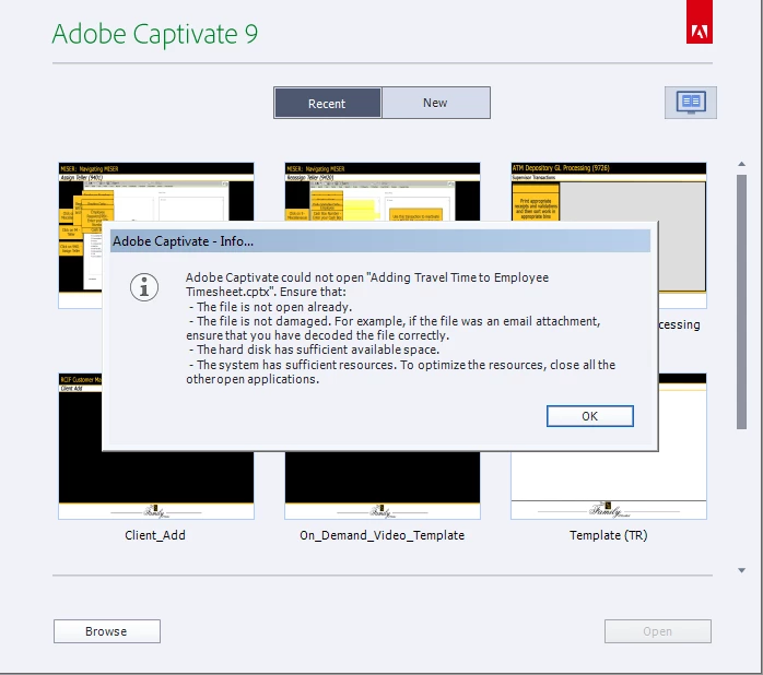 I saved a file in Captivate 9 on Friday afternoon on the company network before I left. I was able to publish it and everything seemed fine. Unfortunately I noticed a typo and wanted to jump back in to correct it and I am getting this error.