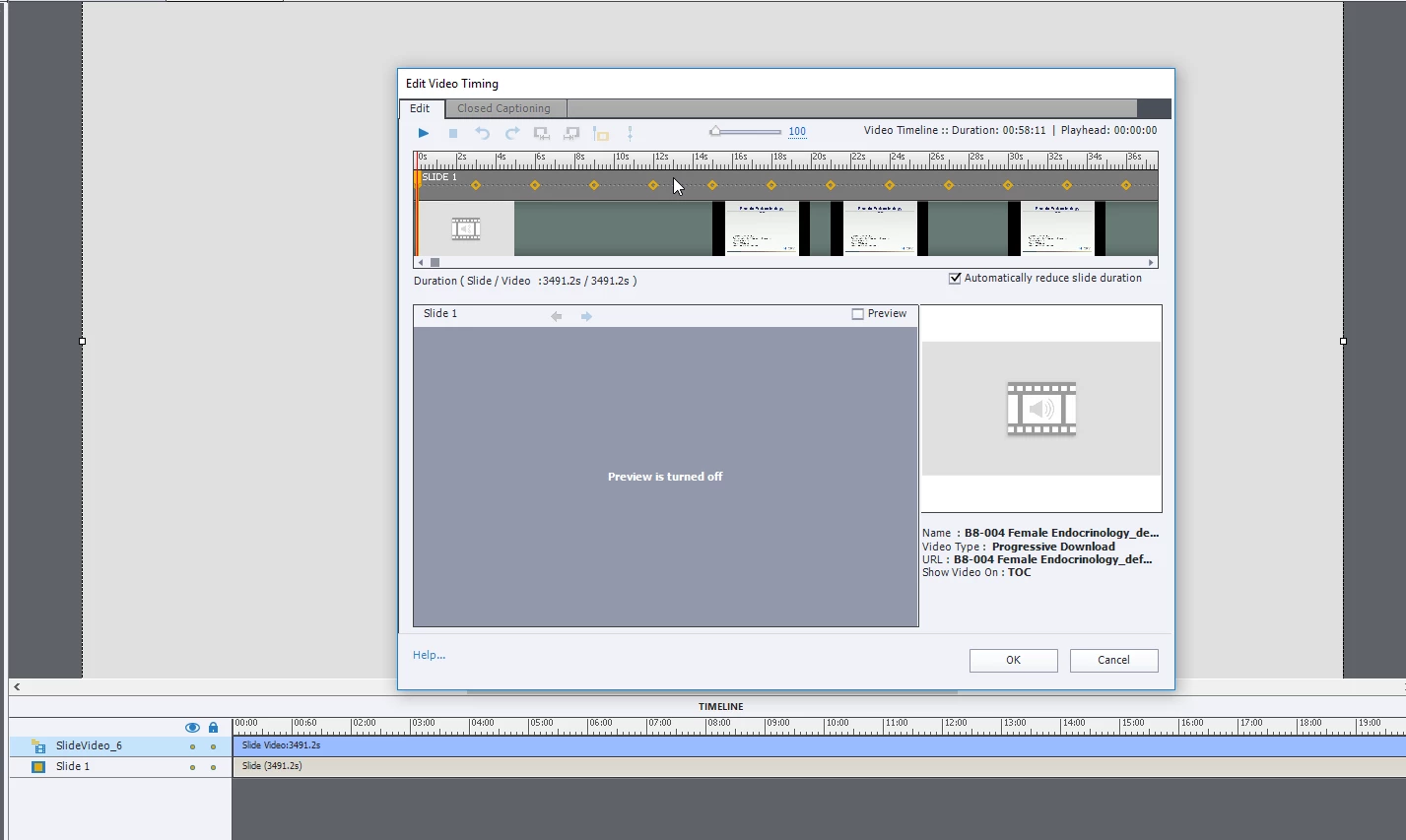 You are almost there with the Edit Video Timing window. What is missing is the you only have a single slide. Based on what you show as what is probably the table of content information on the slide in your post, you would need 7 slides one for an intro and 6 for the content. So add six blank slides to your project and then reopen the Edit Video Timing window. Once you have added the slides you will see number slide markers along the timeline in this window.(Generally, you find at the very right-hand side of the timeline and you begin by moving them to the left along the timeline) Move the markers along the timeline and apportion the appropriate content to a given slide. When you click ok Captivate will distribute the video over the six slides. You will see the video icon at the bottom each thumbnail in the slides panel. Then use the properties panel and add slide titles (found at the top of the slide properties). You can then use the TOC in the skin and generate a TOC or you can create links from the first page to the appropriate slide.