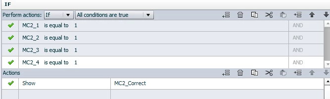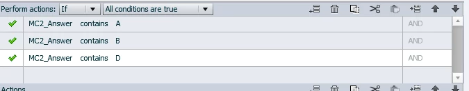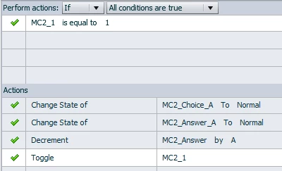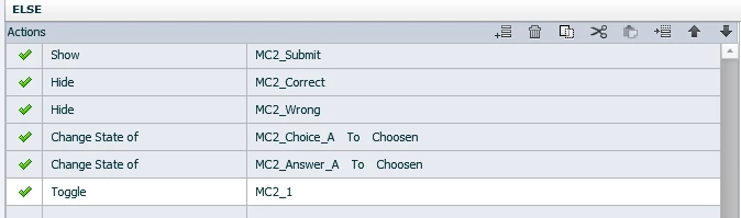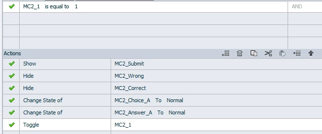 I created a nice toggle so that the question changes state when clicked and goes back to normal when clicked a second time. I assigned a variable(MC2_Answer) with the letter corresponding to the choice. When the click "A" an A is put in the variable using "increment". Since this question needs 3 of 4 answers chosen I planned on using "contains" in an advanced action to show a correct smartshape. So correct answer is A, B, and D. if the learner chooses these then A, B and D are added to the MC2_Answer variable.