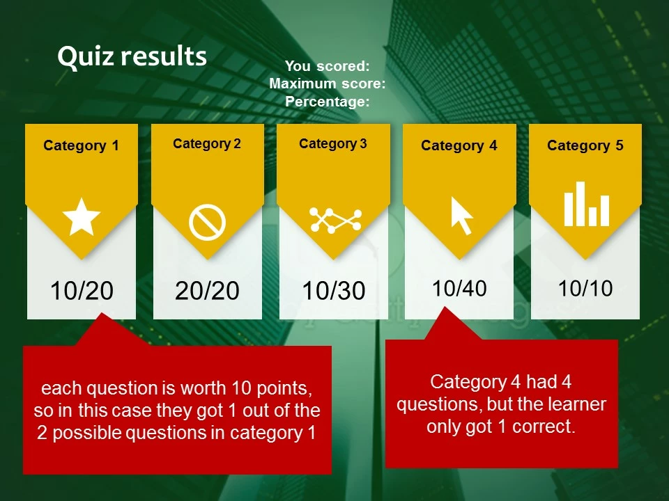 We are using Captivate 9 and we want to create a custom quiz results page with five categories (each quiz question is tagged with 1 of 5 interaction IDs) Each question in the module will have points assigned to one of the five categories. Each question will be worth 10 points. Each question uses a built in multiple choice or hot spot quiz question slide. We want the results screen to tally and display the learner's score in each category. So for example if there are three questions in category 1 and I get two right, we want the results screen to show this: Category 1: 20/30.