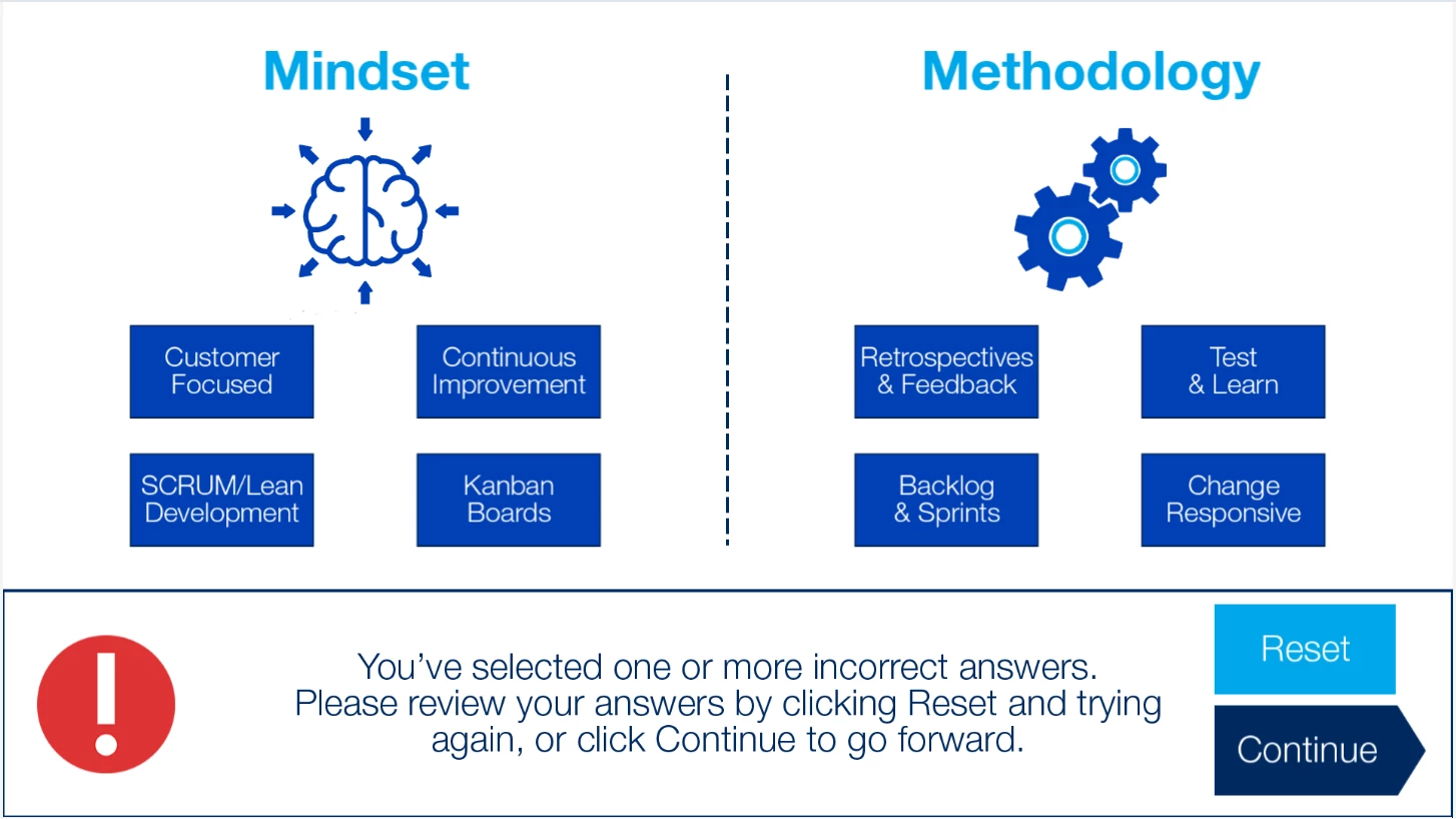 The problem is with the "incorrect" group. This group again has a shape, an image, text, and two buttons: A Continue button to go to the next slide, and a Reset button. What I want the Reset button to do is to reset the dragged items and hide the group panel, basically reverting the slide to the beginning. This Reset button is not the one built into the drag & drop, but is instead a shape button. I did this because I couldn't find a way to hide or show the built-in reset button.