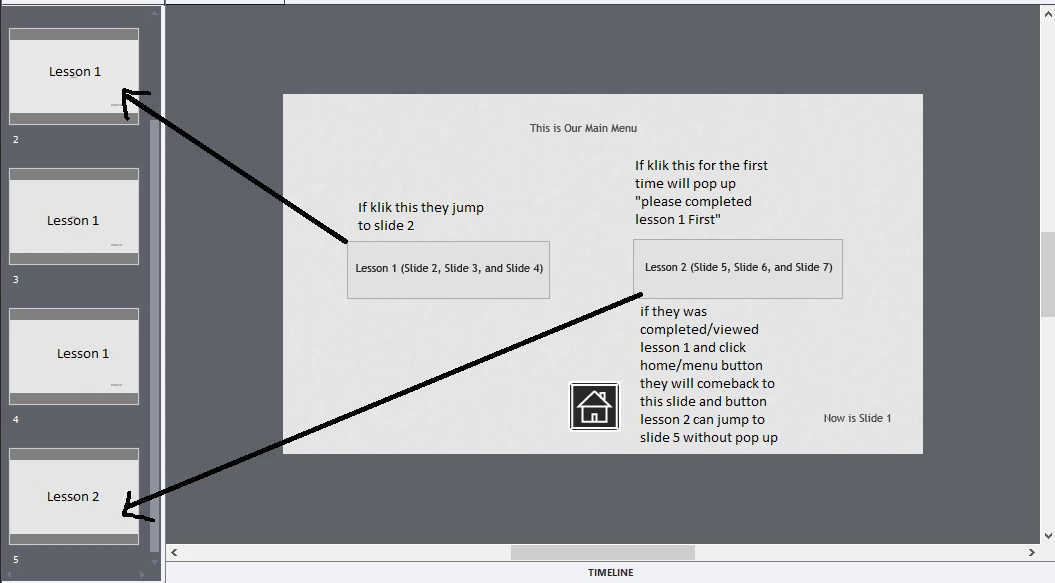 and 2nd menu is jump to slide 5 but it cant be clicked if they didnt pass slide 2,3,4 and got alert "please complete 1st menu"..and if they was pass slide 2,3,4 this menu can be clicked (its maybe happen if they click back button from slide 4 to slide 1 again) .
