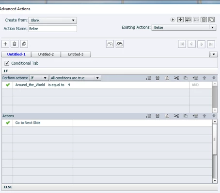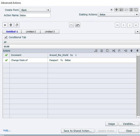 I created 4 separate actions for each of the countries (Belize, Saudi Arabia, France, and Mexico) and set it up to execute an advanced action after each object is dropped onto the drop target. The variable counter is showing that for each drop action the "score" increases by 1. So far, so good.