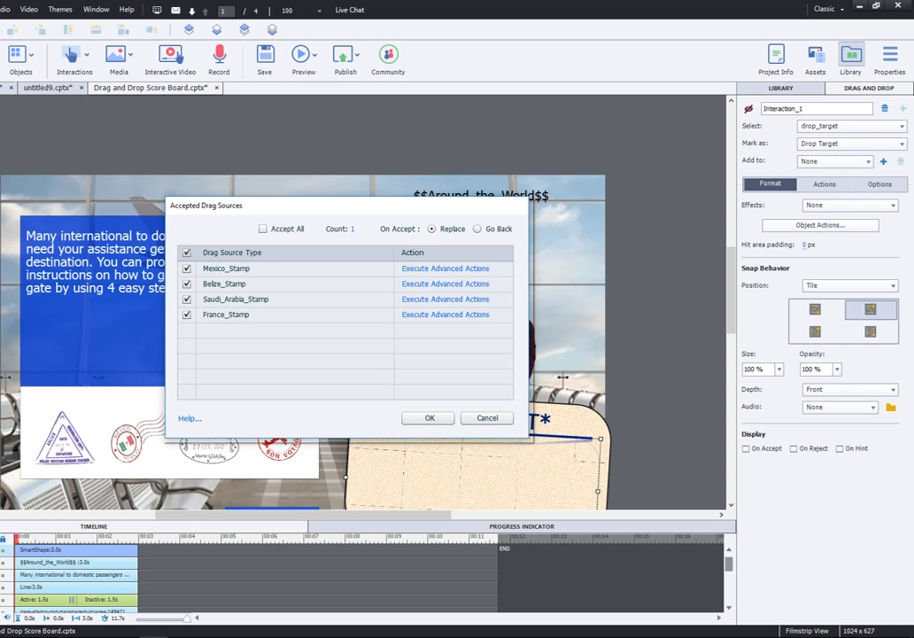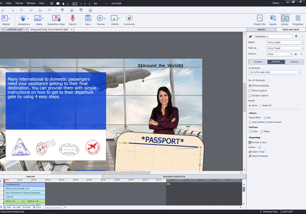 I have created a World Travel themed interaction where the user learns about different countries by using a drag and drop scenario. When the user drops a passport stamp onto the drop target (same target for all 4; but with 4 different states) they are given more information about the topic. The idea is that once they have completed all 4 actions they are taken to the next slide for a new activity. And here's where the problem begins...