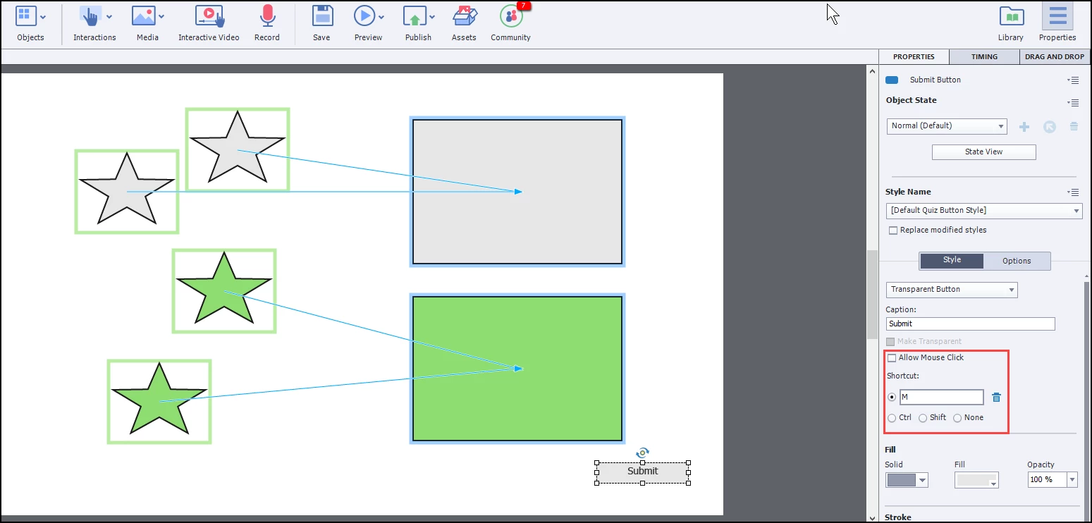 Using captivate 2019, I've created a drag and drop interaction and everything is working normally except for the shortcut function. In the past, I have moved the submit button off screen and enabled the shortcut to go to next slide upon "enter". However, as soon as I click off of the button after changing the shortcut key, Captivate removes this shortcut. I tried other shortcut options (numbers and letters) and the shortcut remains. It seems as though "enter" is the only shortcut that Captivate will not accept.