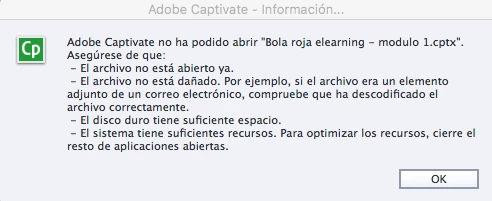 Quiero saber porqué al tratar de abrir un archivo en adobe captivate no me lo permite y me aparece ese cuadro, aclaro que los archivos que trato de abrir están desde una memoria usb. Los archivos que quiero trabajar se crearon en otra máquina en el captivate.