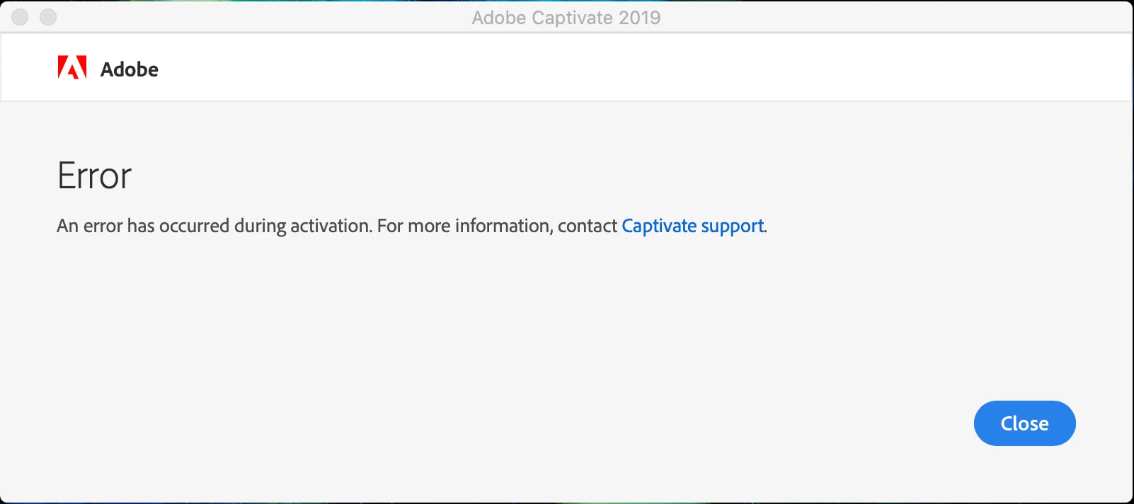 Started recieving this error message when trying to launch captivate.  I am logged into adobe through chrome but when launching captivate from Macbook this error populates and then closes captivate automatically. Clicking link to Capitvate Support does not help resolve and customer care sent me to this forum for resolution  from Captivate support