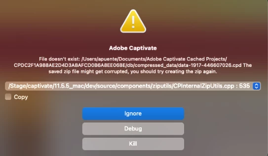 I am on the latest version of MacOS and captivate. Anytime I try to save after changes, I get this error below... any thoughts? How can I check this location?