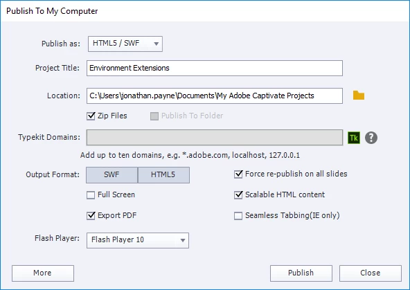Hey group. So I'm wanting to publish out to interactive PDF, hence the export to PDF option in the first screenshot below. When I publish, my PDF opens to a blank page with a message about installing the required version of Flash (second screenshot). I've quadruple checked that Flash is installed and up to date, restarted multiple times, and nothing is working. I sent the PDF to a coworker, and they could open the PDF in Reader DC with no issues. Doesn't matter what I open it in, browsers or Reader DC, just a blank screen. Anyone ever had this issue?